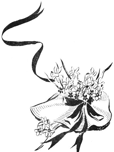 Use a large picture hat or make a hat with stiff paper for this. Arrange a large maline or ribbon bow to trail on the table from the crown of the hat. Place flowers in the center of the crown or arrange flowers around the crown of the hat.