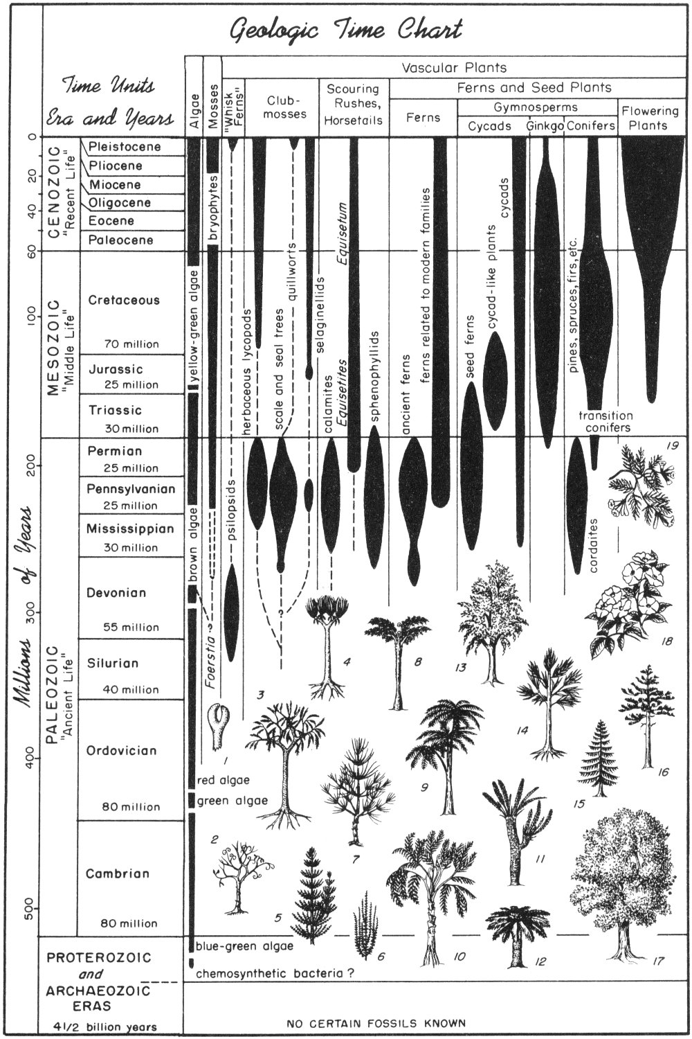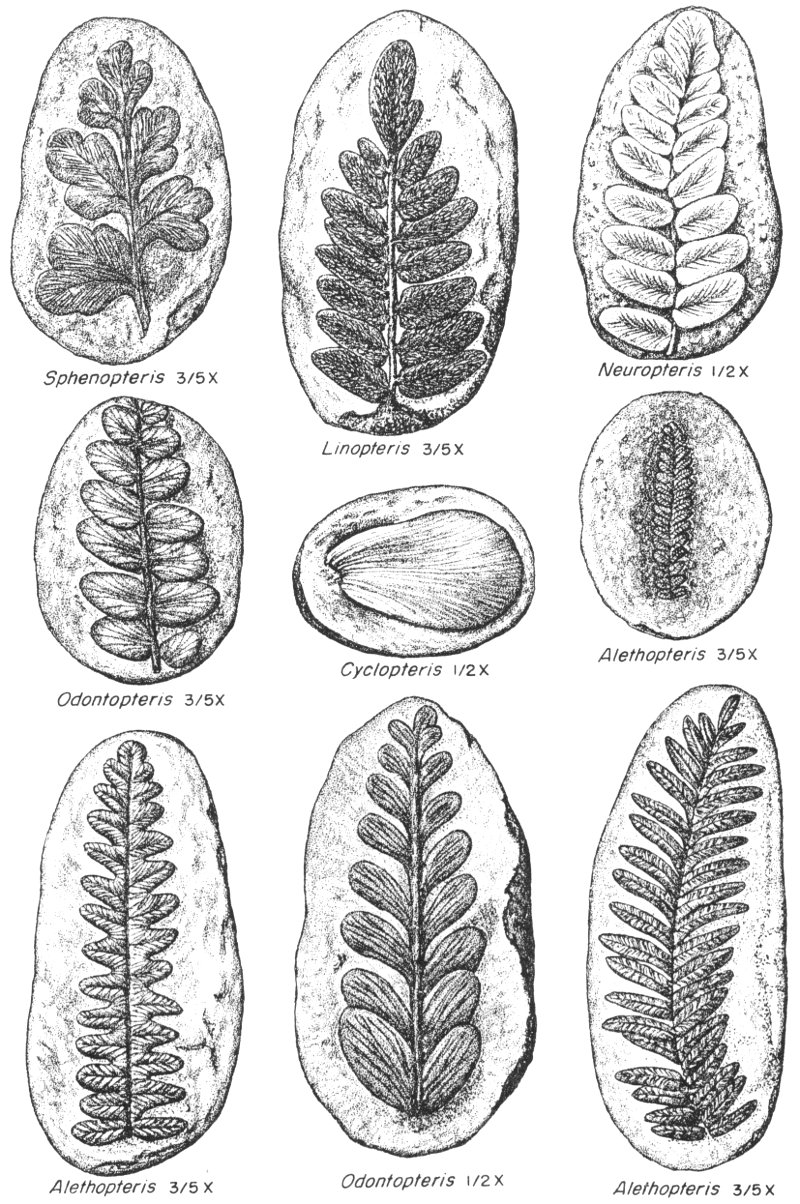 The fossilized plants of Pennsylvanian time belonged to only a few main categories: scale and seal trees, ancient scouring rushes (horsetails), herbaceous Sphenophyllum, ferns, seed ferns, and cordaitean trees.