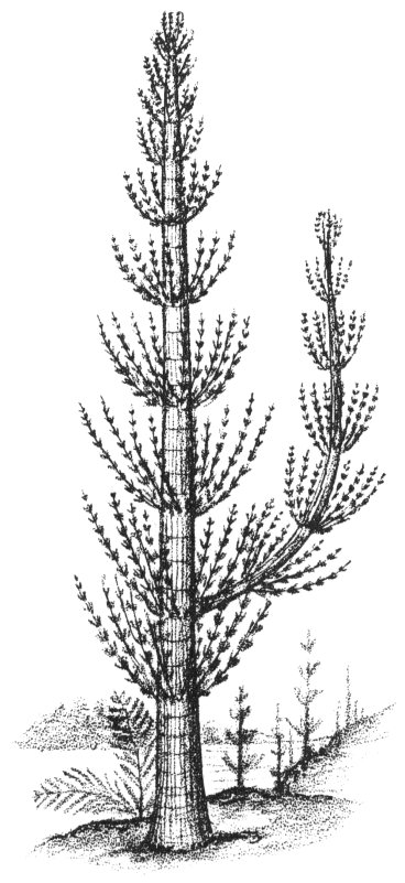 Although related to the small, inconspicuous horsetails of today, the ancient scouring rushes of the Pennsylvanian 13 Period grew to the size of trees and were among the most widely distributed plant groups.