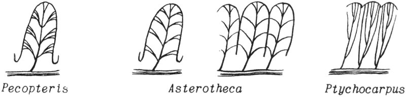 Because fossils of complete fern plants have not yet been found, separate names have been adopted for detached leaves, stems, and other parts. For example, the fossil stems of some Pennsylvanian ferns found in Illinois have been referred to two genera, Megaphyton, whose leaf attachment scars are arranged in two vertical rows, one on either side of the stem, and Caulopteris, 15 whose leaf scars are arranged in a steep spiral that becomes progressively flatter upward until near the top they appear to be whorled. When the stem is a petrifaction, with internal structures preserved, it is called Psaronius. The fronds are referred to a number of genera, but those most commonly found in Illinois are Pecopteris, Asterotheca, and Ptychocarpus.