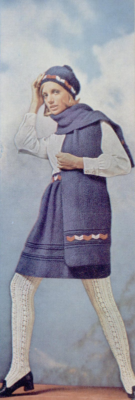 FINISHING: Embroider stockinette st section same as skirt starting in 1st st of 1st row. Sew seam and draw top tog. Run elastic through band at upper and lower edges. POMPON: Wind Navy 125 times over a 3 inch cardboard, slip off cardboard, tie in center; cut both ends and trim into shape. Attach to top of beret.