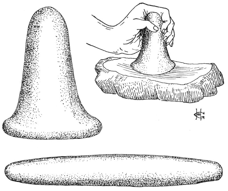 For crushing and grinding corn and seeds into meal, primitive peoples used simple stone implements, several of which are shown above. The type of Pestle, shown at the upper left, known as the Bell-shaped Pestle, is found abundantly in Ohio and near-by states. They were used with wooden Mortars or flat stones, and sometimes with shallow stone mortars, like that shown at the upper right, and were suitable either for pounding or grinding.