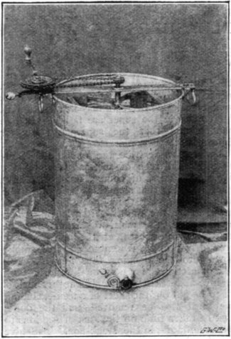 Two combs having been uncapped, they will be placed in the cages of the extractor, and the handle turned so as to make them revolve. This must be done slowly at first. A few turns of the extractor will bring the centrifugal force into play by which the honey will be thrown out in countless drops, which will settle on the inside walls of the extractor, and coalescing, will trickle down to the receptacle in the bottom of the machine in which the clear amber fluid will quickly gather. There is a danger, in turning the handle too fast, of the honey not getting extracted on the inside of the comb, pressing on the midrib, and breaking through it, especially in warm weather when the wax is soft. This danger is reduced by the use of “wired” combs. In from five to ten minutes’ time the honey will cease to flow from the combs. The turning must then be stopped, the combs lifted out and replaced in the extractor with the reverse side outward, the revolving process being then repeated to extract the honey from the second side of the comb. When the combs are again lifted out they will be emptied, and the extractor will be ready to take another pair of uncapped combs. The emptied combs should be given back to the bees, either to be filled again with honey, or to be licked clean preparatory to their being put away for the winter for use next year.