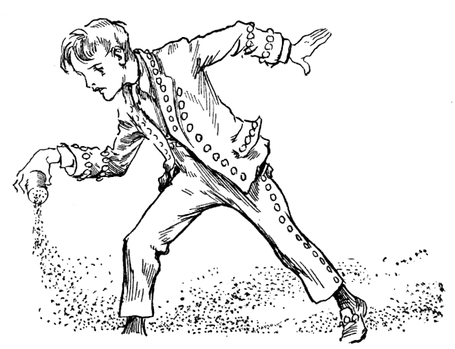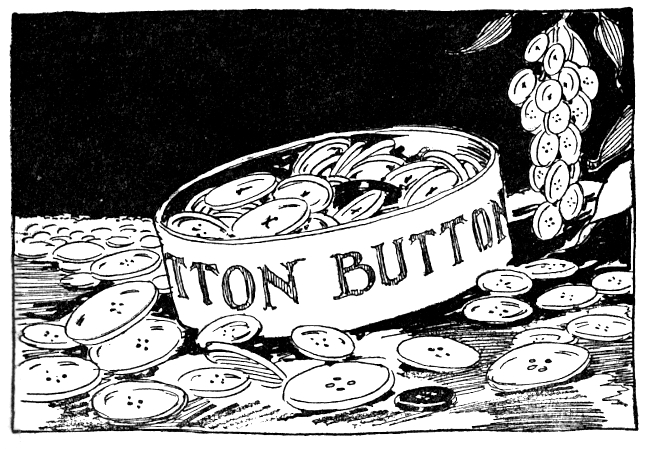 The boys' work was almost as delightful. Every morning they would scamper into the button wood with Kinda Jolly and shake down a good crop of buttons. Then each button boy would fill his button box with a gay assortment and set off down the King's Highway to sell them to the good dames in the Gilliken Country. There are no stores in Oz, so they never had any trouble in disposing of their wares, especially the collar buttons. The men of the Gilliken country are as good at losing collar buttons as men in your own town, so by noon time the button boxes would be full of coins and the button boys would come racing back to the castle with nothing more to do for the rest of the day but play quoits or "button-button-who's-got-the-button?"