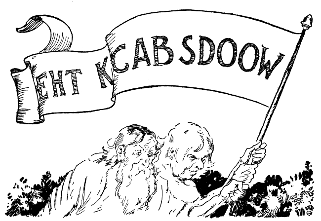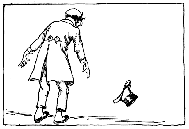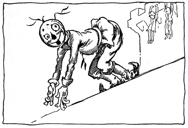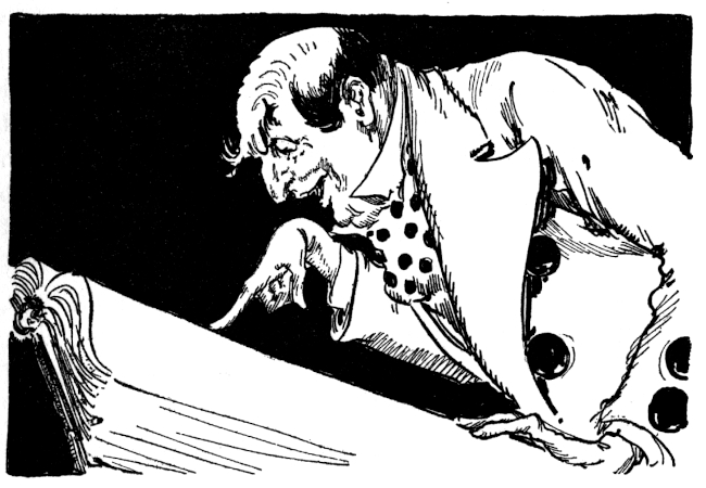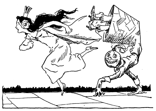 That was what Snip heard Mombi mumble, bending over a peppery mixture on the fire. So dreadful was her expression as she scowled into the frying pan that Snip tumbled from the window sill into a rose bush. Picking himself up, he rushed down the garden path convinced that the King was done for. But there was Kinda Jolly, with his silver crown, walking calmly under the button trees. Snip looked again to be sure Kinda was not turning to a collar button and then, a little ashamed of being so easily frightened, he crept back to the ledge to see what Mombi would do next. He was just in time to see her fling the frying pan down the cellar steps and kick over a basket of potatoes. Then, grumbling and snarling and rubbing her shins, she limped into the garden to fetch the goose Kinda Jolly had bought for dinner—for magic or no magic the cooking had to be attended to. The goose had come straight from a neighboring farm and was still in the flimsy wooden crate. Scowling and scolding, Mombi slammed the crate on the table and ripped off the top slats.