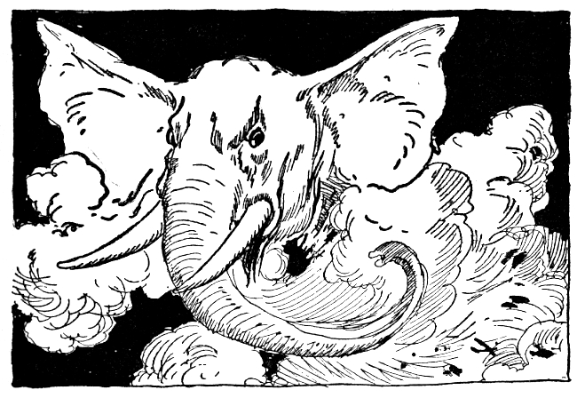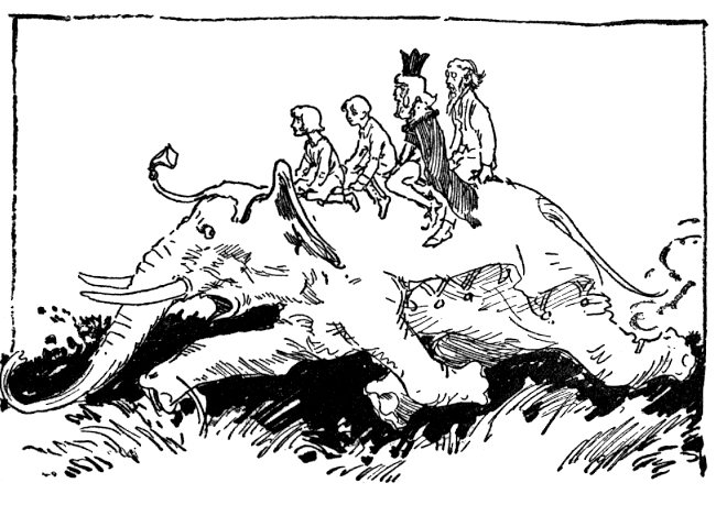 "I'll take you back," volunteered Kabumpo carelessly. "It's on my way home anyhow." The Elegant Elephant was also anxious to be off and acquaint the court of Pumperdink with the important events that had transpired. He wished to display the emerald head-piece Ozma had given him, and dazzle the courtiers with the silver robe bestowed upon him by the kingly tailor of Oz. So after a quick luncheon, a quick exchange of good-byes and good wishes, the pompous old elephant took his departure, carrying on his back brave General Whiffenpuff, the Invisible Cook and the gallant little button boy of Kimbaloo.