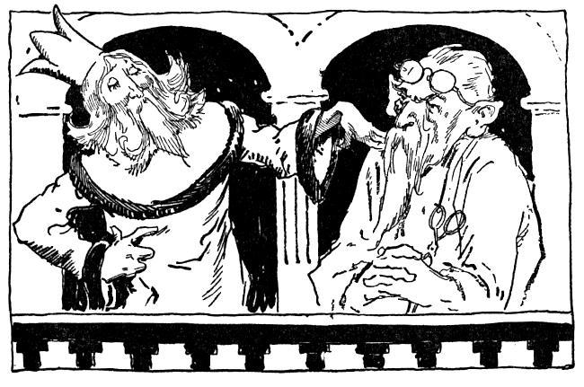 "Pajuka!" cried the tired tailor. Rushing joyously down the steps of the throne, he threw both arms 'round a fat, jolly old gentleman. The tired tailor, did I say? But no! He was the tired tailor no longer! The rounded shoulders had straightened up under the velvet robe, the tired eyes sparkled with pleasure and kindliness. Tora, the tailor, no longer, but Pastoria, the King, stood embracing his prime minister, for the same green formula that had restored his majesty had also released Pajuka from his weary enchantment.