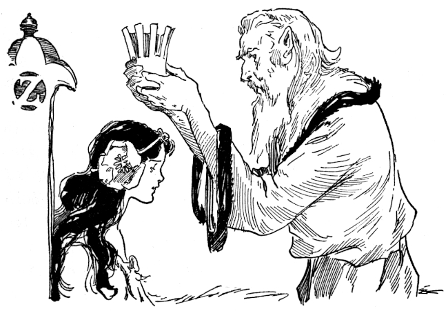 Taking turns, Dorothy, Trot and Ozma did their best to satisfy him. Then Pastoria, himself, told how Lurline, Queen of the Fairy Band, had come to his shop, tried to disenchant him and when she found Mombi's magic too strong for her, had bestowed upon him his remarkable flying ears.