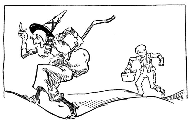 But after you have been a witch all of your life, it is dreadfully hard to settle down to being just an ugly old woman. Mombi had stood it as long as she could, and then one day she had closed up her little hut at the foot of the Gilliken mountains, taken her crooked stick, and set out to seek a position as cook in one of the castles of Oz—for she felt that only among a great many kettles and cauldrons could she ever be contented or at home. Besides being cross and crooked, Mombi was so ugly and ill-tempered that most of the castle doors were slammed in her face, but one day she had come to Kimbaloo. Hobbling through the button wood she found King Kinda Jolly under a shoe button tree. Falling upon her knees Mombi begged him so hard to let her remain as cook that the gentle old monarch finally consented, though much against the advice of Hah Hoh, the Town Laugher. But Kinda, thinking her a poor and needy old woman, had kept her nevertheless, and as Mombi, like many another old witch, was an excellent cook, he had never regretted his bargain. In spite of her wonderful cooking no one had ever grown really fond of her, but she was treated with consideration and respect and allowed to do pretty much as she pleased in the castle kitchen.