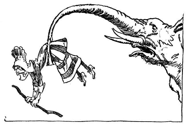 "Keep a trunk on that witch!" called Scraps to the Elegant Elephant, as they all jumped up and started to follow the Scarecrow from the room.
