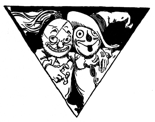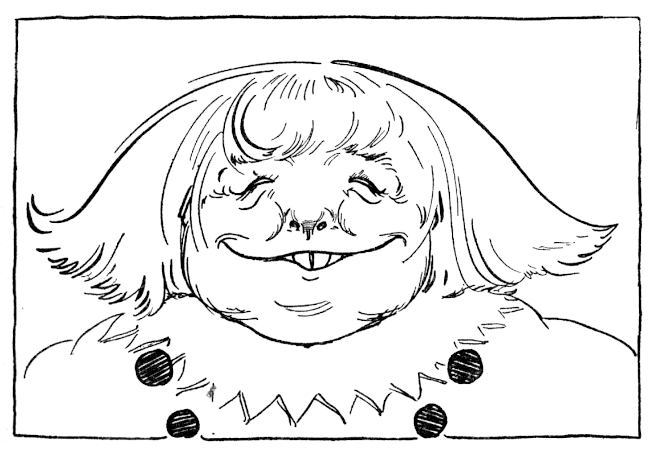 There were some who thought the castle, built as it was of dark purple button wood, studded with rows and rows of bright buttons, extremely odd, but it suited Kinda Jolly and Rosa Merry right down to the cellar and the five hundred inhabitants of Kimbaloo thought it extremely magnificent. No doubt they were right. However that may be, anyone who had seen Kinda Jolly and Rosa Merry walking in the gardens on pleasant summer evenings would have had to admit they were the most lovable little couple in the land. Kinda was short and fat and Rosa was short and merry. They both dressed in the purple costumes of the Gillikens, but their robes were trimmed all over with buttons that chinked delightfully when they walked and almost dazzled one by the brilliance of their colors.