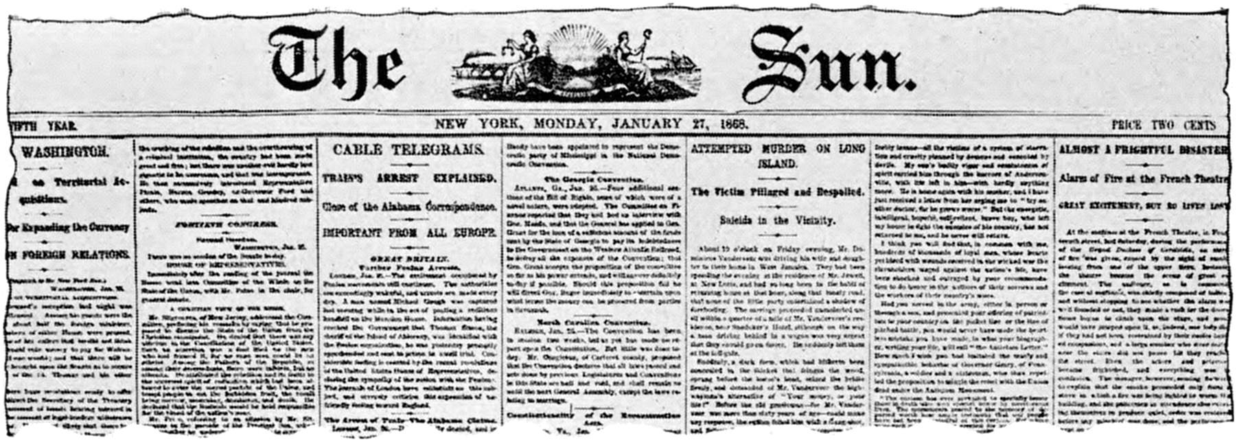 1868.—Charles A. Dana becomes the editor and manager of the Sun, January 25.