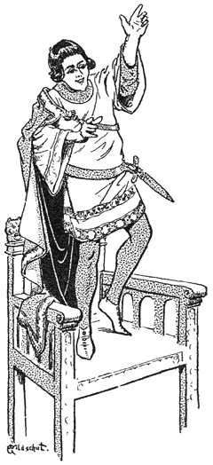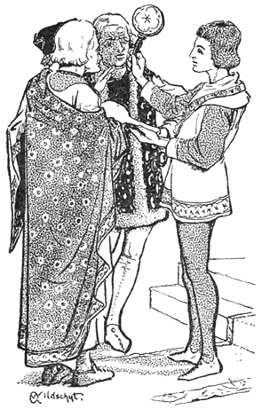 En den derden dag kwam er een page in blauw en wit satijn met kostbaar goud borduursel en hij zeide: