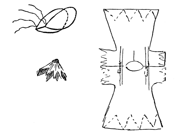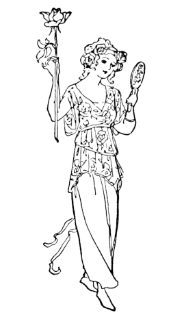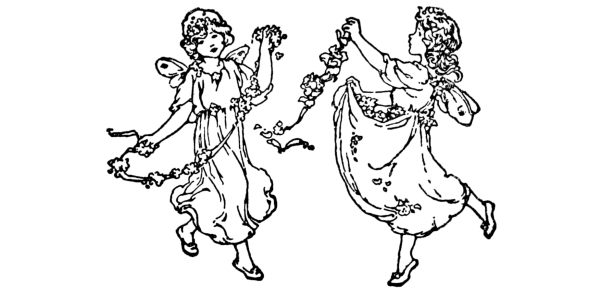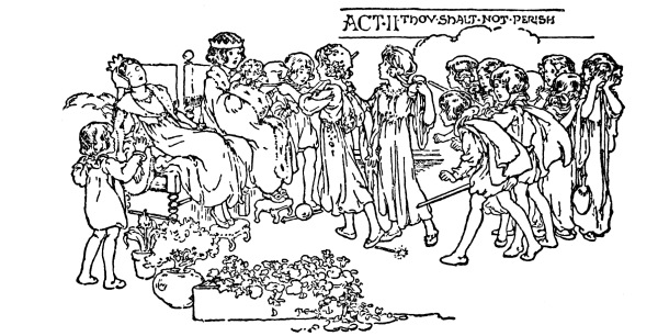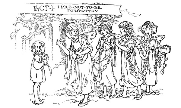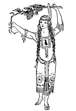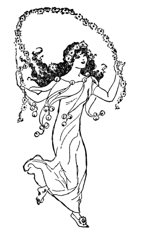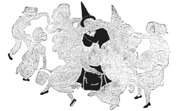 The Queen and her Fairies are in white, with silver tinsel and crystal ornaments, and carry wands with silver stars. They may wear either trailing draperies, or short “Pierrette” dresses, with silver ruffs, rosettes, and little pointed caps.