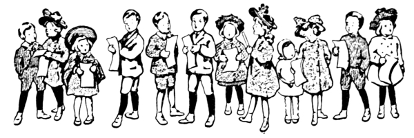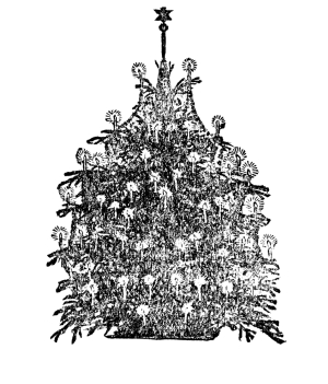 The woods in winter. If scenery is not available, a generous supply of white sheets and cotton batting will make an effective setting, with a few small evergreens, and bare boughs. A large Christmas tree should be utilized as part of the scene; place it to right of center, and trim lightly with silver tinsel, “snow,” and glass icicles. Near the tree, a couch or seat should be built up and covered with white, to represent a little mound; upon this the Queen sits, and later, the children recline. The time is about sunset; a red light, if available, will be effective early in the scene, while toward the end it grows darker. A curtain is not absolutely necessary, although of course more “like a play.”