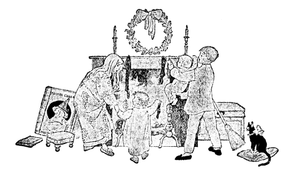 [In the bed at center the Maiden lies asleep in her little frilled night cap and gown. Her stocking is hung on the bedpost. At the left on a small table a tiny candle burns.