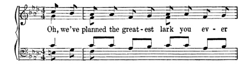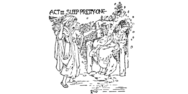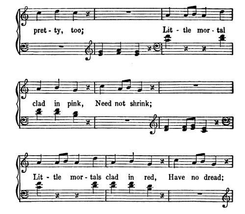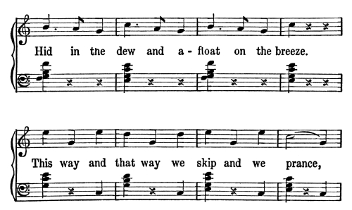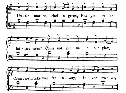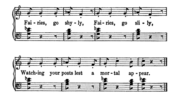[Fairy touches him with wand. He stands up, stretches himself, then sits on his little stool and sings:]