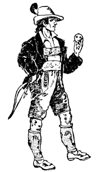 The Holly Elves; “Pierrot” or “Yama-Yama” suits of green, with caps, ruffs, buttons and slipper-rosettes of scarlet. They carry branches of holly.