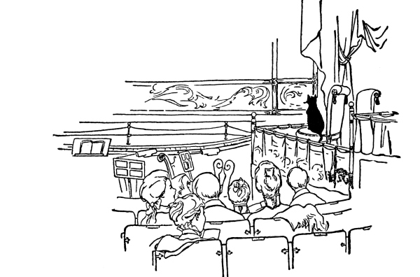 [The Fairy touches him with her wand. He begins to turn about, displays his curly tail, and spits at the little Maiden when she slyly pulls it. Little Maiden strokes his back, and he sings a meow solo to the tune of “Auld Lang Syne.” All applaud.] [Pg 7]