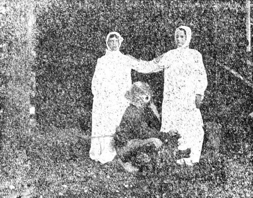 At right foreground sits the Bunny. He is dressed in a white sleeping garment which covers hands and feet, and a little flannelette cap with long, upstanding ears which are wired and colored pink on the inside.