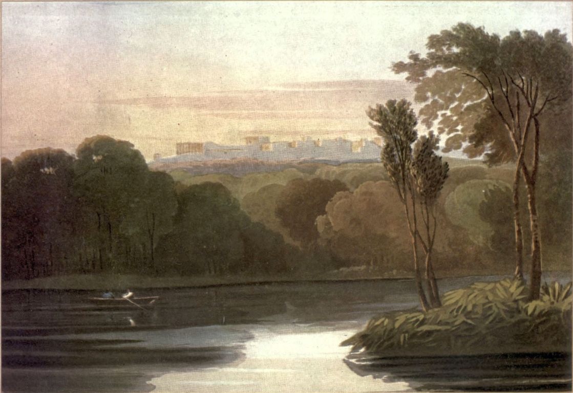 The upper part of the sky is coloured with indigo, lake, and a little gamboge, gradually softened in with light ochre as it descends, and toward the horizon with light red. The Castle is laid in with a warm tint of indigo and light red, then shaded lightly with indigo and lake. The different greens in the woods are composed of indigo, burnt sienna, and gamboge, varied as required; the shadows in the nearer parts, indigo and burnt sienna; the water with the same colours. The trees in the foreground are indigo and burnt sienna, and the finishing touches with Vandyke brown. The whole of the foreground and wood glazed with brown pink.