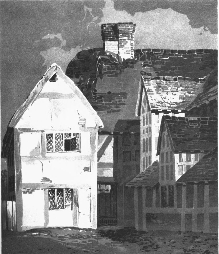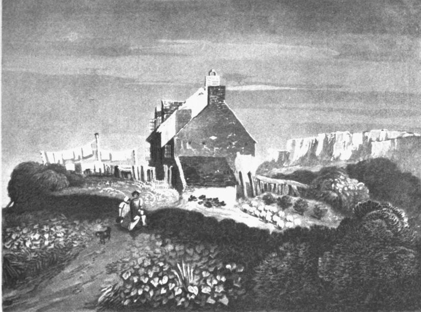 Is intended as a contrast to the foregoing Plate, producing, by the effect of a dark sky, a strong light upon the principal object. The colours for the sky are composed of indigo, lake, and ivory black; the distance, indigo finished with the same colour and a little lake. That part of the cottage where the light is strongly reflected, is yellow ochre, with a little burnt sienna mixed in the richer tones; the roof is black and lake, with a little burnt sienna, finished with the same; the shadows and the grey tint upon the timber, indigo and Indian red; the road, with indigo and Indian red also, which is finished with Vandyke brown and lake. The greens for the bank and the bushes are indigo, burnt sienna, and gamboge, completed with indigo and brown pink, and a few touches of Vandyke brown.