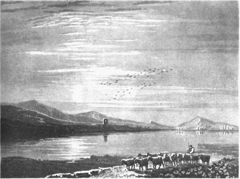 The principal art of Landscape Painting consists in conveying to the mind the most forcible effect which can be produced from the various classes of scenery; which possesses the power of exciting an interest superior to that resulting from any other effect; and which can only be obtained by a most judicious selection of particular tints, and a skilful arrangement and application of them to differences in time, seasons, and situation. This is the grand principle on which pictorial excellence hinges; as many pleasing objects, the combination of which renders a piece perfect, are frequently passed over by an observer, because the whole of the composition is not under the influence of a suitable effect. Thus, a Cottage or a Village scene requires a soft and simple admixture of tones, calculated to produce pleasure without astonishment; awakening all the delightful sensations of the bosom, without trenching on the nobler provinces of feeling. On the contrary, the structures of greatness and antiquity should be marked by a character of awful sublimity, suited to the dignity of the subject; indenting on the mind a reverential and permanent impression, and giving, at once, a corresponding and unequivocal grandeur to the picture. In the language of the pencil, as{12} well as of the pen, sublime ideas are expressed by lofty and obscure images; such as in pictures, objects of fine majestic forms, lofty towers, mountains, lakes margined with stately trees, rugged rocks, and clouds rolling their shadowy forms in broad masses over the scene. Much depends upon the classification of the objects, which should wear a magnificent uniformity; and much on the colouring, the tones of which should be deep and impressive.