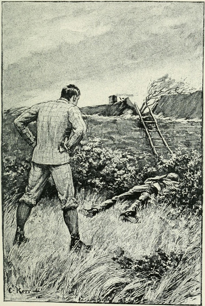 “Now, Jeremy, my boy, where are you? O, there! Well, excuse my taking the liberty of kneeling on your chest, and holloa out if the assegai goes into you. If we are going to have a performance at all, it may as well be a realistic one. Now, uncle, you see when we finished rolling, which was just as this assegai snapped in two, as luck would have it I was uppermost, and managed to get my knee on my friend’s left arm and to hold his right with my left. Then, before he could get loose, I drove this bit of spear through the side of his throat, just there, so that it cut the jugular vein, and he died shortly afterwards; and now you know all about it.”