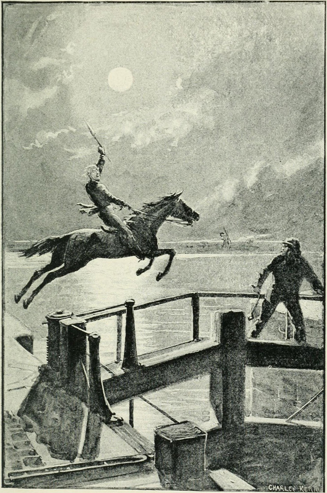 On they come. Before them is the wide sluice; if they are mortal, they will turn or plunge into it. No; the great black horse gathers himself, and springs into the air.