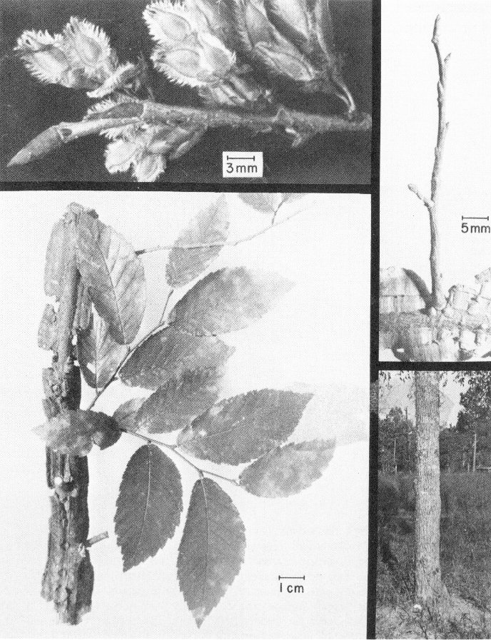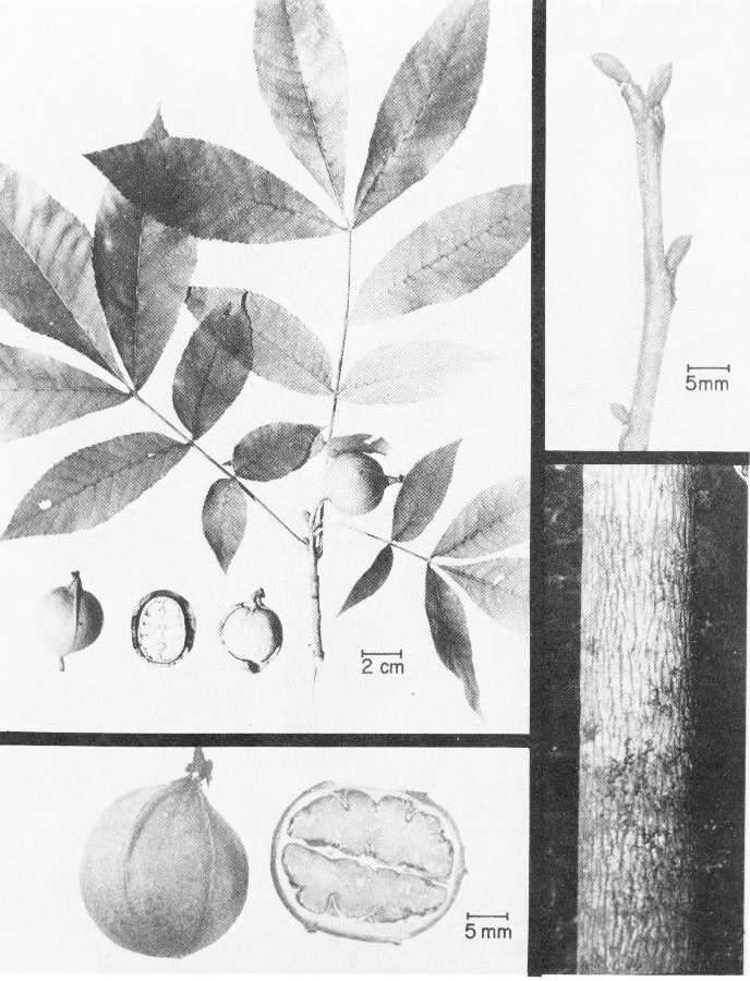 Bark grayish, tight, marked with distinct diamond-shaped ridges and furrows. Branches stout, drooping to spreading and ascending. Twigs 10 to 12 mm in diameter, conspicuous leaf scars. Buds (terminal) 10 to 15 mm long, 5 to 8 mm in diameter, scales imbricate. Leaves alternate, deciduous, odd-pinnately compound, 20 to 40 cm long with 5 to 7 drooping leaflets; yellow hairs and glandular hairs on lower leaflet surface, apex acuminate, margin finely serrate, base obtuse, on very short petiolules. Flowers unisexual, appearing in spring with developing leaves, staminate in 3-parted drooping catkins, pistillate terminal on new growth. Fruit subglobose to obovate, 3 to 5 cm in diameter, husk 1 cm thick, slow to open, shell of nut thick and hard, meat sweet.