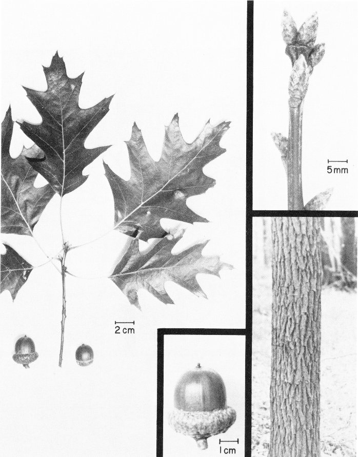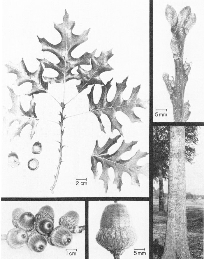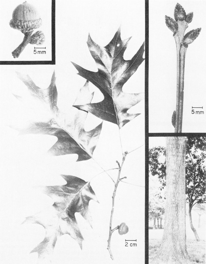 Bark dark grayish-black, divided into irregular fissures and scaly ridges. Branches stout, spreading to ascending. Twigs 3 to 4 mm in diameter, reddish, turning a dull red. Buds ovoid, acute, 5 to 7 mm long, covered with rounded, lightly pubescent scales. Leaves alternate, deciduous, simple; glabrous, except in axils of main veins on underside, oval to slightly obovate, 8 to 17 cm long, 5 to 13 cm wide, with 5 to 9 deep lobes often terminated by secondary lobes with bristle tips, sinuses usually deep, round, and wider than lobes; both surfaces pale green, upper surface shiny, bright scarlet in autumn, petioles about 4 cm long. Flowers unisexual; staminate in catkins with developing leaves; pistillate on pubescent peduncles. Fruit an acorn; cup 15 to 30 mm wide, covered with brown scales enclosing about one-third to one-half of the nut; nut ovoid, 10 to 20 mm long, occasionally with ring grooves near apical point at maturity.