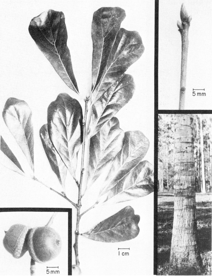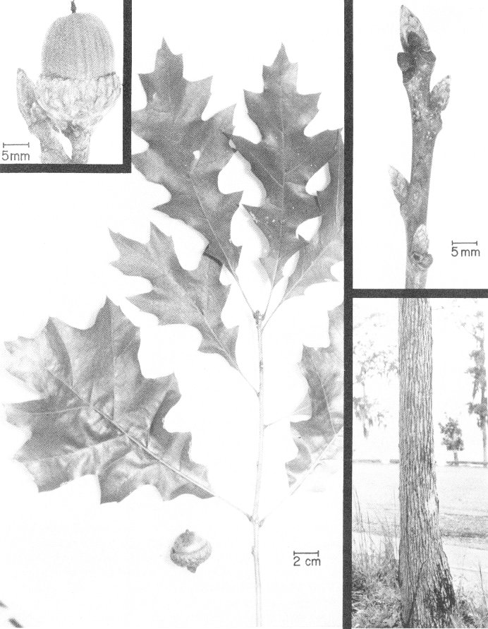 Bark dark gray to gray-black consisting of appressed scales in narrow flat ridges with shallow furrows. Branches stout, spreading to ascending. Twigs 2 to 4 mm in diameter, reddish, lightly fluted. Buds ovoid, 10 to 15 mm long, angled, scales pubescent with dark margins. Leaves alternate, tardily deciduous, persisting into December, simple, oval to oblong, 12 to 20 cm long, 7 to 8 cm wide; with 5 to 11 lobes, major lobes opposite each other, large rounded sinuses extending nearly to the midrib, margin entire with occasional bristle-tipped teeth near the apex of the lobes, dark green above, permanently pubescent below, sometimes thinly so, varying from white to rust color, especially on drying. Flowers as in Q. falcata. Fruit an acorn broader than tall; cups 12 to 15 mm wide; nut about 8 to 10 mm long, subglobose, flattened at base, rounded at apex.