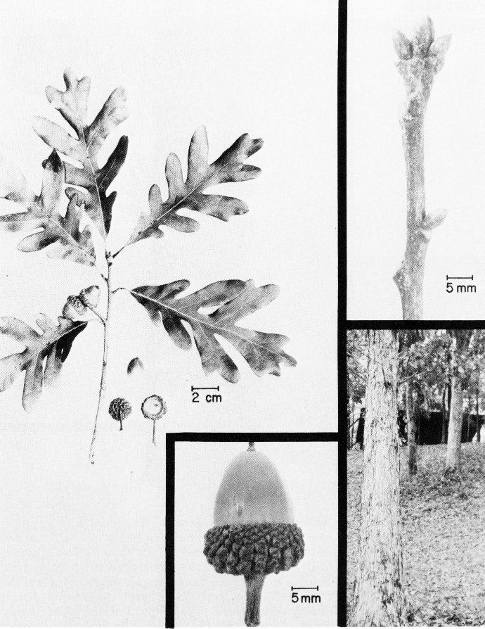 White Oak, Q. alba L., has a thin, light green leaf with a light glaucous bloom at maturity; it is oblong or ovate, with rounded lobes and three to five narrow sinuses extending nearly to the mid-rib. The cup scales of the acorn-cup are heavy and distinct.
