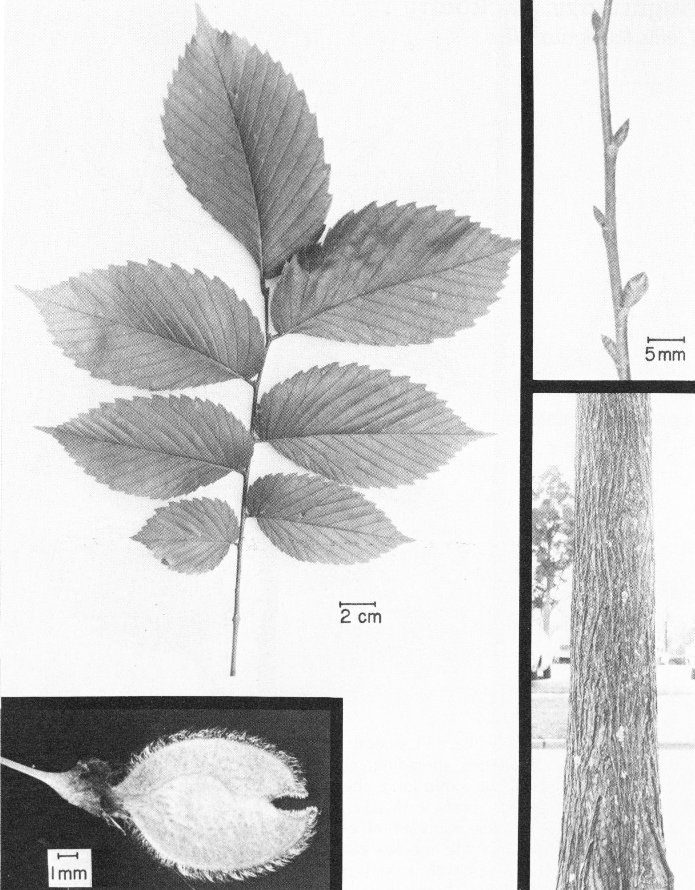 Common elms include American Elm, Ulmus americana L., and Winged Elm, U. alata Michx. Both bloom after a freeze breaks dormancy. For example, if a killing frost occurs in the last week of November or the first week of December, American elm will bloom the first week of January. If no killing frost occurs by early December. American elm may not bloom until the third week of January. Winged elm usually blooms 10 days to 2 weeks later than American elm. Small winged elm trees frequently have a corky outgrowth on opposite sides of twigs at least 3 years old. Mature trees often lack this characteristic. The American elm leaf has unequal basal lobing and pubescent or ciliate samaras about 12 mm in diameter; winged elm has a smaller leaf with round to acute leaf bases and a very ciliate samara about 8 mm long.