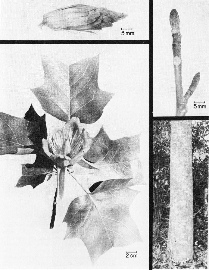 Yellow-poplar, Liriodendron tulipifera L., or tulip tree, has alternate, four- to six-lobed leaves with truncate to distinctly notched apices, a unique feature among American trees. The flowers are tulip-like with red markings on a greenish-yellow background. The fruit is a cone-like aggregate of samaras.