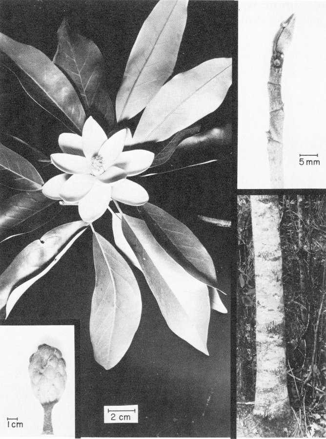 Sweetbay, Magnolia virginiana L., produces moderate-sized trunks on uplands or numerous pole-like suckers in branch bottoms. It is evergreen in the southern part of its range and deciduous in the northern portion. A wind blowing in the crown will expose the silvery underside of the leaves. The white flowers, about 5 to 10 cm in diameter, open for the first time about 3 p.m. and close about 9 p.m. They reopen the next morning and shed their stamens. The fruit is a green pickle-like aggregate of follicles that splits open to reveal red seeds. Sweetbay and yellow-poplar, both members of the Magnolia family, have stipule scars circling the twigs.