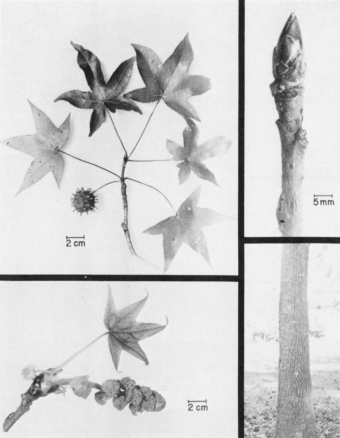 Sweetgum, Liquidambar styraciflua L., or redgum, is easily recognized by its alternate, star-shaped, palmately lobed leaves. Some trees have corky outgrowths on the small branches. Its flower consists of several round clusters of stamens arranged in a raceme and a stalked pistillate head that develops into a spiny, woody fruit containing many seeds.