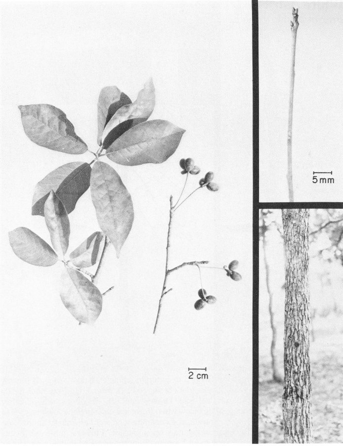 Bark light to dark gray, often blackish, rough and deeply furrowed. Branches stout, drooping to spreading. Twigs 3 to 5 mm in diameter, reddish brown, smooth. Buds ovoid, acute, glabrous, 8 to 12 mm long, scales imbricate. Leaves alternate, deciduous, odd-pinnately compound, 20 to 40 cm long, usually with 7 leaflets; upper pair and terminal largest, 10 to 15 cm long by 4 to 6 cm wide, broadly oval to slightly obovate. Flowers unisexual, staminate in 3-branched catkins appearing about the time of leaf maturity; pistillate terminal on new growth. Fruit oblong to obovoid to obpyriform, 30 mm in diameter by 35 mm long, husk about 3 mm thick, tardily dehiscent, shell of nut thick, meat sweet.