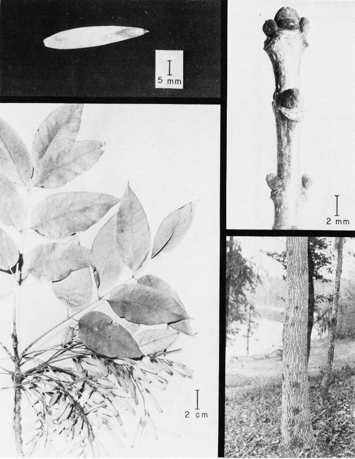 Two of the most common ashes are White Ash, Fraxinus americana L., and Green Ash, F. pennsylvanica Marsh. The most reliable distinction between the two species appears to be samara differences. White ash has a plump, short seed end with the wing practically terminal, whereas green ash has a slender seed end and the wing extends more than halfway down the seed end. White ash usually has a rounded leaflet base, but green ash has wedge-shaped leaflet bases. The undersurfaces of fresh white ash leaves are white, but the color is difficult to detect on dry specimens. Green ash leaves are green on both surfaces, although somewhat paler on undersurfaces.