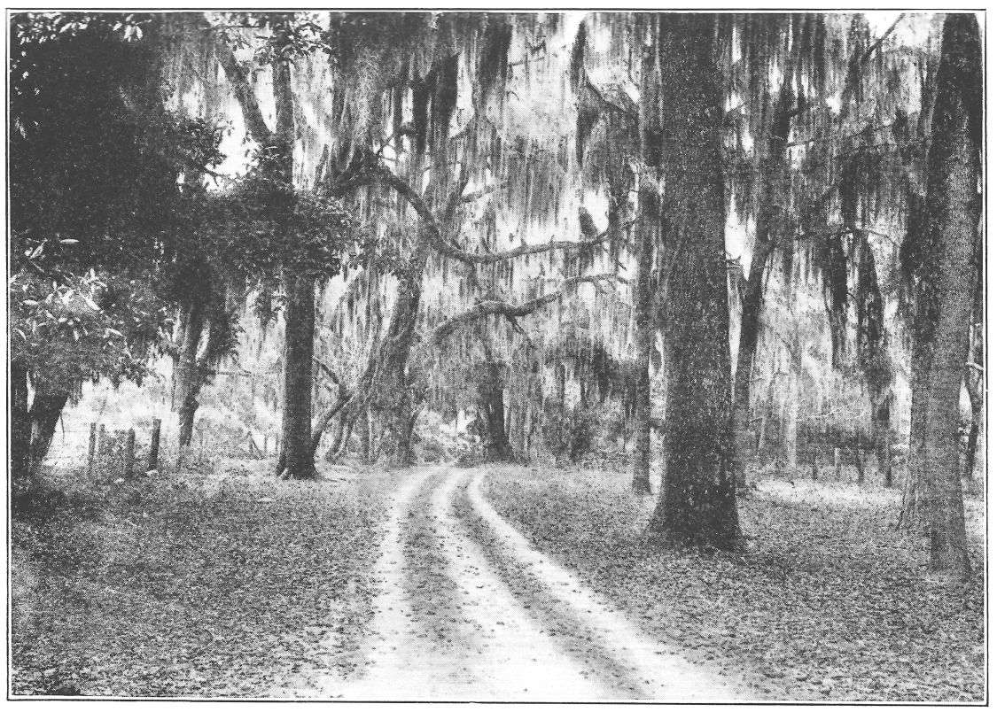 myself in a Cape Cod village. The neat white fences were the same, the sand was the same with sparse grass growing from sidewalk to wheel tracks, and the live-oaks that arched till their limb tips touched and made play of soft shadows and softer light underfoot might well have been the Massachusetts elms. Only the profuse draperies of the moss pendant from every branch and twig were new, informing the place with a golden glamour of grace and mystery.