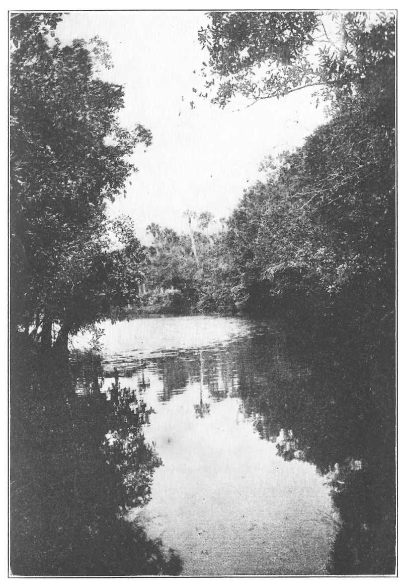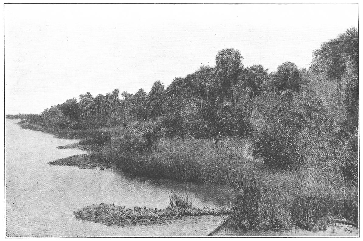The little river steamer that takes you up the St. Johns from Jacksonville to Orange Park soon leaves the uproar of the city, the skyscrapers and drawbridges, tugs, lighters, and coastwise steamships behind, and puffs onward into placid reaches that to the eye have changed little since the days of De Soto. If plantations and villages exist ashore there is but little indication of them. The banks are lined with verdure, green and gray,—green with the foliage of century-old live-oaks and tall, long-leaved pines, gray with exquisite festoons and dangling draperies of the moss that decorates every tree and fairly smothers some of them. There is a crinkly grace, an elderly virility about it that is most engaging. It takes but little effort of the imagination to see the red cheeks and twinkling eyes of a myriad disciples of Santa Claus peering through it ready to bring gifts to all good children. I have yet to see with what costume they simulate the good saint in this country. If they do not make his beard of this softly beautiful, crinkly, fatherly gray moss I shall feel that they miss an excellent opportunity. Here{10} and there through the moss and among the big, rough tree-trunks a tiny road winds down through the needle-carpeted sand and leads to a slender long pier, built far out over the shallow reaches of the river to a landing for the river boats. The stream is miles wide in its lower course, but only in its channel is it deep. Shallows stretch far from either bank and fleets of water hyacinths voyaging seaward with the current strand sometimes far from shore. The fifteen-mile trip is thus like one into a sub-tropical wilderness untouched by the chill of approaching winter, little marred by the hand of man. The miracles of gorgeous autumn coloring which we left behind in the Massachusetts woods find no echo here. Now and then a sumac leaf shows dull crimson or the wild grape takes on a somber yellow, yet these tiny dots of color are no more to be noticed in a general survey of the forest than the bright hues of the butterflies that swarm at midday in the bright sun and a temperature of eighty in the shade.