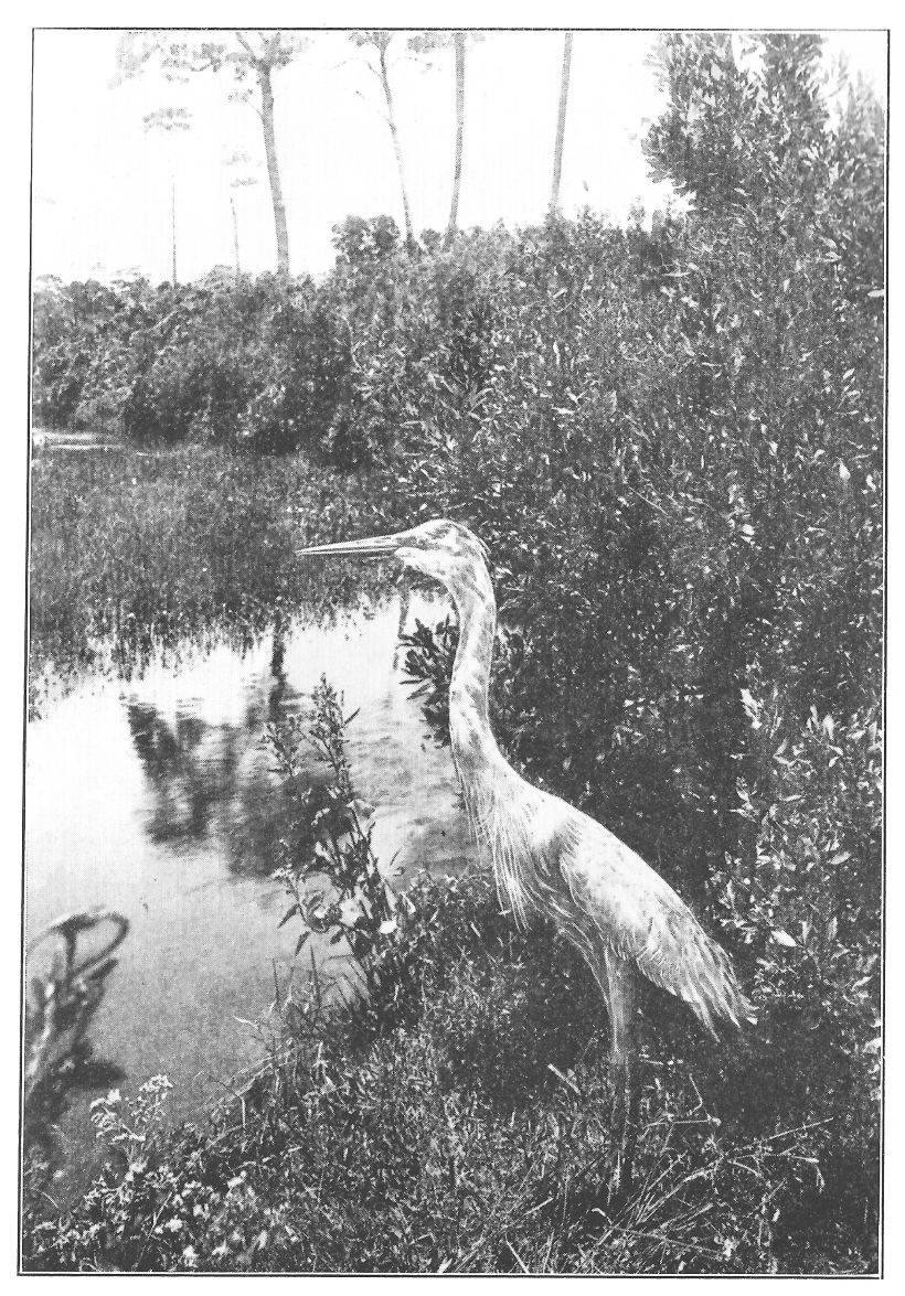 The first Florida land bird that I saw was the buzzard. If the cormorant is the statue of repose, the buzzard is the poet of motion. I suspect that this bird was the original mental scientist. He moves by thought-power alone. I am always reminded, in watching his progress, of the ancient story of the Chinaman watching his first electric car. The buzzard certainly has no visible “pushee” or any observable “pullee.” But how silently and beautifully he goes. Never a flap of the broad black wings and never a quiver of the widespread primary tips. He just thinks himself along, against the wind or with it, up or down. His broad wings are like the prayer rug of the Arabian tale. He adjusts himself upon them, stretches forth his bald red neck and just wishes himself in some place, near or far, and forthwith he sails swiftly to it. In what as yet unexplained principle of progress he finds his power no pres{9}ent-day aeroplanist can say. When he finds out, the flying man of the future may do away with the motor which so frequently fails to mote and the propellers which break in mid-air and spill the passenger. Go to the buzzard, thou Bleriot; consider his ways and be wise.