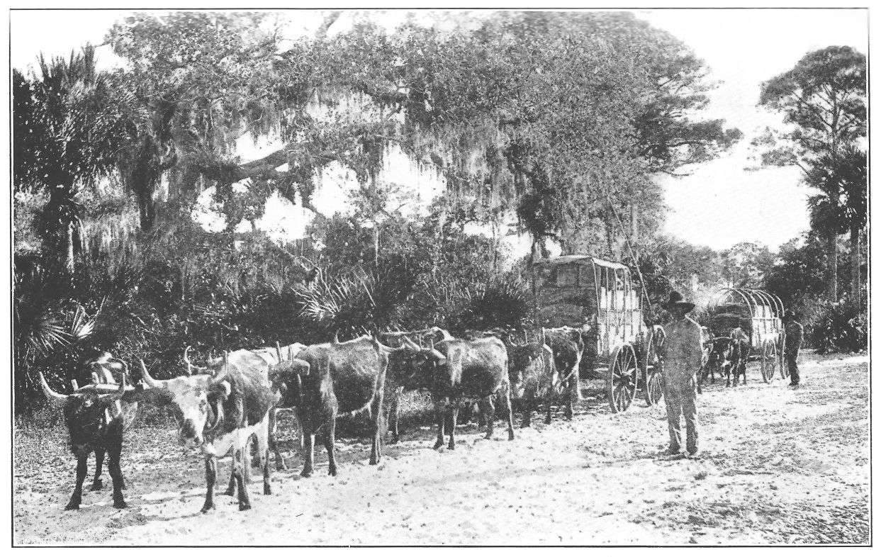 After the mocking bird’s whistle came a second melodious note, the tinkle of passing cow-bells, recalling to mind once more quiet elm-shaded New England streets and rock-walled pasture lanes. Yet in this tinkle was a puzzling note as the cattle passed and the sound faded into the distance, a bubbling change of tone, a liquid drowning altogether new and delightful. I followed its siren call to find myself led, as by the sirens of old, to water. Down the streets of a morning wander the scrub cows of the place, munching live-oak acorns as they pass to their grazing grounds, the shallow waters of the St. Johns. Into this they wade fearlessly, often neck deep and a quarter-mile from the shore, sinking their heads to the bottom to feed on the tender herbage of aquatic plants. The tinkle of the cow-bells catches its bubbling note and its drowning fall in its continual submergence and resurgence. It is as characteristic of a St. Johns River town as the melody of the mocker, different, but perhaps equally delightful in its musical quaintness.{13}