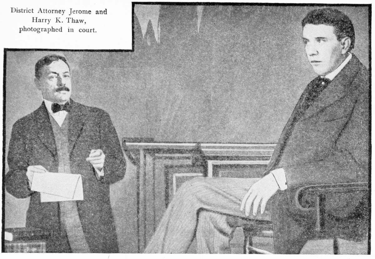 There was a brief delay, then the pen door opened and Thaw came in ahead of a prion keeper and took his place, smiling a trifle at his wife and mother.{288} Thaw’s relatives had been in the building an hour or so before the jury came in. They all bore themselves in the same impassive manner. Grave they were, but none of them appeared in the least excited. Evelyn Thaw herself looked as if she has passed a wretched night. She was paler than usual and her eyes looked as if she might have been weeping. District Attorney Jerome and Assistant District Attorney Garvan were in their usual places, as also were all of the prisoner’s counsel.
