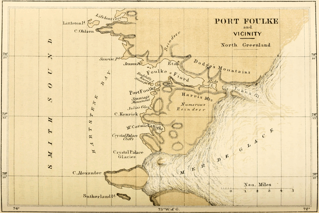 Off Cape Sabine there are two islands, which I name Brevoort and Stalknecht; and another, midway between them and Wade Point, which I name Leconte. A deep inlet running parallel with the Cadogen Inlet of Captain Inglefield, fringed all around with glaciers set into the dark rocks like brilliants into a groundwork of jet, opens between Wade Point and Cape Isabella. I leave the naming of it until I see whether Inglefield has not a bay set down there, as I have not with me the official map of his explorations.