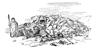 Upon going ashore at Gale Point, I discovered traces of Esquimaux much more recent than those at Gould Bay and other places on the shores of Grinnell Land. Indeed they were of such a character as to cause me strongly to suspect that the shore is at present inhabited. The cliffs are composed of a dark sandstone which, to the northward of the Point, breaks suddenly away into a broad plain that slopes gently down to the water's edge. This plain is about five miles wide, and is bounded at the north much as at the south, by lofty cliffs, which rise above the primitive rocks back of Cape Isabella. The plain was composed of loose shingle, covered over in many places with large patches of green, through which flowed a number of broad streams of water. These streams sprang from the front of a glacier which bulged down the valley from the mer de glace. It was about four miles from the sea, and bounded the green and stony slope with a great white wall several hundred feet high, above which the snow-covered steep of the mer de glace led the eye away up to the bald summits of the distant mountains. As I looked up at this immense stream of ice it seemed as if a dozen Niagaras had been bounding together into the - 425 - valley and were frozen in their fall, and the discharging waters of the river below had dried up, and flowers bloomed in the river-bed. My journal compares it to a huge white sheet, hung upon a cord stretched from cliff to cliff.
