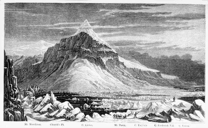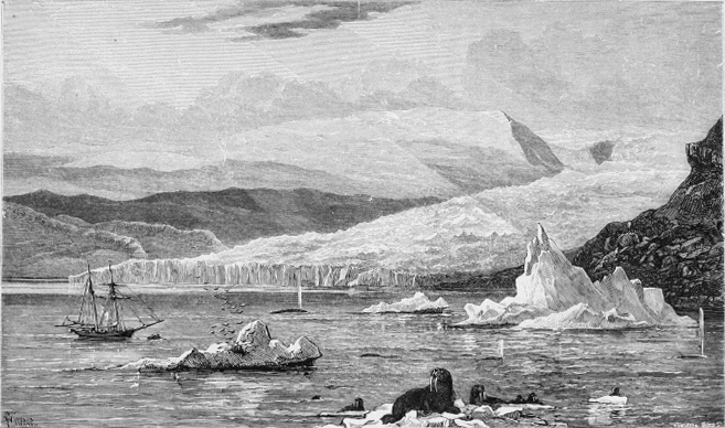 The view up the Sound from Cape Isabella was truly magnificent. The dark, wall-sided coast, rendered more dark in appearance by the contrast with the immense cloak of whiteness that lay above it, was relieved by numerous glaciers, which pour through the valleys to the sea. The mer de glace is of great extent, and, rising much more rapidly and being more broken, gives a picturesque effect not belonging to the Greenland side, and adds much to the grandeur of its appearance. The mountains are lofty, and are everywhere uniformly covered with ice and snow; and the glacier streams which descend to the sea convey the impression almost as if there had once been a vast lake on the mountain-top, from which the overflowing waters, pouring down every valley, had been suddenly congealed.