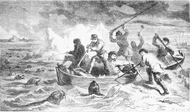 We found a convenient anchorage between Littleton and McGary Islands, and we reached it just in time; for a severe gale, with thick snow, set in from the northward as I had anticipated from the appearance of the sky, and held for several days. Meanwhile the people amused themselves with hunting. A herd of deer was discovered on Littleton Island, and the walrus were very numerous. Four of the latter were captured,—this time, however, not from a boat, but by Hans, in the true Esquimau style. They came along the shore in great numbers, lying upon the beach in the sun, where Hans approached them stealthily, and got fast to them one by one with his harpoon. The line being secured to a rock, the animals were held until they were exhausted, and then drawn in, when they soon became a prey to the rifles. Wishing to obtain a young one for a specimen, I joined the hunters; and, selecting from the herd which lay upon the rocks one to suit my purposes, I fired upon and killed it. The others plunged quickly into the water. The mother of the dead calf was the last to leave the rock, and seemed to do so very reluctantly. In a few moments she came to the surface, and, wheeling around, discovered the young one still lying upon the rock. Finding that it did not answer to her cries, she rushed frantically into the face of danger, and in full view of the cause of her woes, (for I had approached very near the spot,) the unhappy creature, intent only upon rescuing her offspring, drew herself out of the - 418 - water, crying piteously all the while, and, crawling around it, pushed it before her into the sea. I endeavored first to frighten her off, and then tried to arrest her, and save my specimen, with a fresh bullet; but all to no effect. Although badly wounded, she succeeded in her purpose, and, falling upon the dead calf with her breast, carried it down with her, and I saw them no more. I have never seen a stronger or more touching instance of the devotion of mother to its young, among dumb animals, and it came from a quarter wholly unexpected.