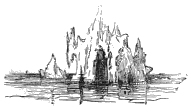 Skirting the northern margin of the ice, we made a course to the northeastward, across the - 427 - North Water, through one of the most charming days that I have spent under the Arctic skies. There was but the feeblest "cat's-paw" to ruffle the sea, and we glided on our way over the still waters through a bright sunshine. The sea was studded all over with glittering icebergs and bits of old floes, and here and there a small streak of ice which had become detached from the pack. The beasts of the sea and the fowls of the air gathered around us, and the motionless water and the quiet atmosphere were alive. The walrus came snorting and bellowing through the sea as if to have a look at us; the seals in great numbers were continually putting up their cunning heads all around the vessel; the narwhal in large schools, "blowing" lazily, thrust their horns out of the sea, and their dappled bodies followed after with a graceful curve, as if they enjoyed the sunshine and were loathe to quit it; great numbers of white whale darted past us; the air and the icebergs swarmed with gulls; and flocks of ducks and auks were flying over us all the time. I sat upon the deck much of the day, trying, with indifferent success, to convey to my portfolio the exquisite green tints of the ice which drifted past us, and watching a most singular phenomenon in the heavens. These Arctic skies do sometimes play fantastic tricks, and on no occasion have I witnessed the exhibition to such perfection. The atmosphere had a rare softness, and throughout almost the entire day there was visible a most remarkable mirage or refraction,—an event of very frequent occurrence during the calm days of the Arctic summer. The entire horizon was lifting and doubling itself continually, and objects at a great distance beyond it rose as if by strange enchantment and stood suspended - 428 - in the air, changing shape with each changing moment. Distant icebergs and floating ice-fields, and coast-lines and mountains were thus brought into view; sometimes preserving for a moment their natural shapes, then widening or lengthening, rising and falling as the wind fluttered or fell calm over the sea. The changes were as various as the dissolving images of a kaleidoscope, and every form of which the imagination could conceive stood out against the sky. At one moment a sharp spire, the prolonged image of a distant mountain-peak, would shoot up; and this would fashion itself into a cross, or a spear, or a human form, and would then die away, to be replaced by an iceberg which appeared as a castle standing upon the summit of a bill, and the ice-fields coming up with it flanked it on either side, seeming at one moment like a plain dotted with trees and animals; again, as rugged mountains; and then, breaking up after a while, disclosing a long line of bears and dogs and birds and men dancing in the air, and skipping from the sea to the skies. To picture this strange spectacle were an impossible task. There was no end to the forms which appeared every instant, melting into other shapes as suddenly. For hours we watched the "insubstantial pageant," until a wind from the north ruffled the sea; when, with its first breath, the whole scene melted away as quickly as the "baseless fabric" of Prospero's "vision;" and from watching these dissolving images, and wooing the soft air, we were, in a couple of hours, thrashing to windward through a fierce storm of rain and hail, under close-reefed sails.
