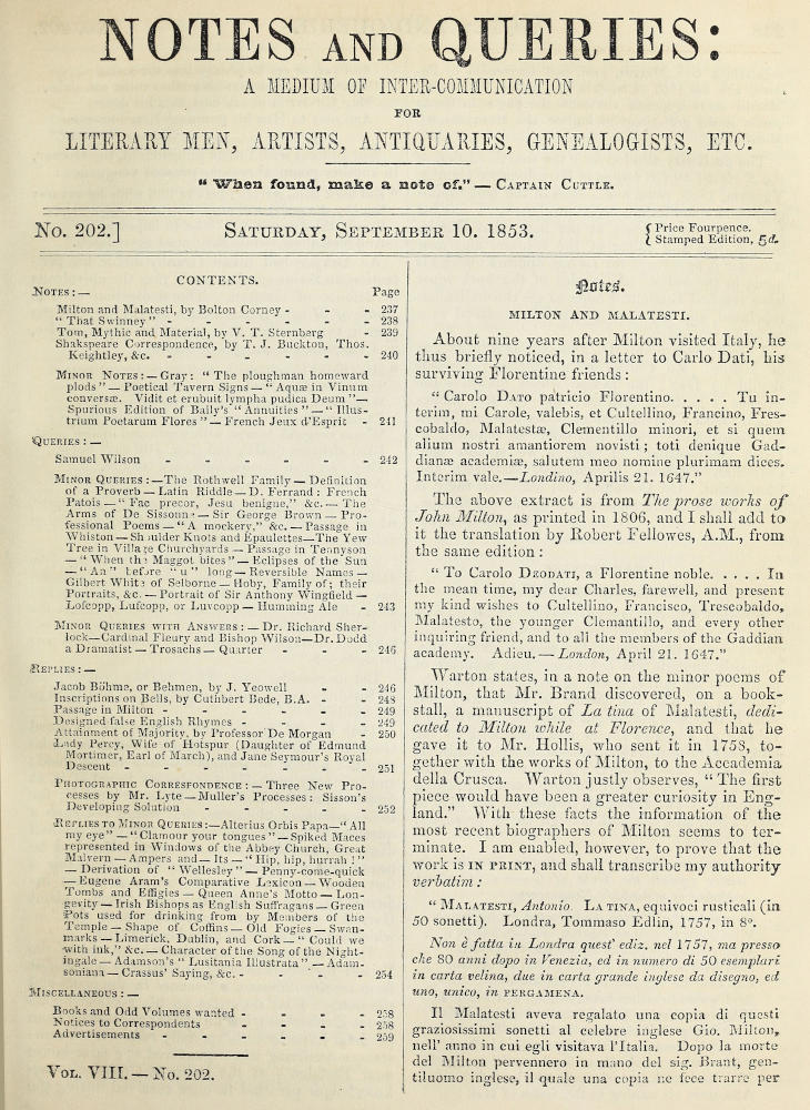 | Milton and Malatesti, by Bolton Corney | 237 |